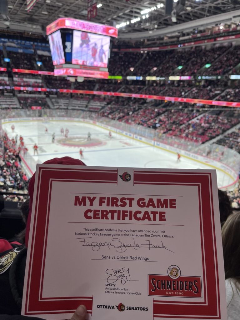 Together, we shared ideas, built connections, and brainstormed ways to create meaningful sport experiences for newcomers in St. John’s and Ottawa. After finishing our training, we all went to enjoy an NHL game in Ottawa, and that was my first-ever ice hockey arena experience. For someone who never had access to sports growing up, sitting in that arena felt surreal. It was more than just a game—it was a symbol of everything I had missed, and everything I now have the chance to create for others. I even received my first game experience certificate—a small but deeply meaningful milestone.